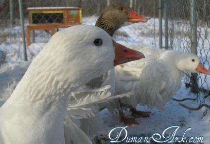 | Blue Eyes - Sebastopols are so striking with those curly bright white feathers and crystal baby blues! - 2012-02-16 23:33:15 |
