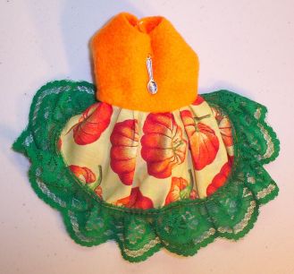 These little dresses are made in a variety of ways. This one is a Pumpkin Print trimmed with green lace and has a Orange polar fleece top complete with a little bitty spoon for eating pumpkin.