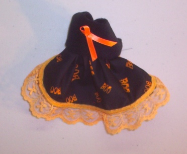 These little dresses are made in a variety of ways. This one is a Boo Print with a Balck polar fleece top complete with a little Orange bow and Orange lace trim.