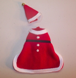 santamax2 2004-11-29.jpgThe Santa Coat is approx 5 1/2" from behind the ratties neck to the tail and the waist is approx. 8 1/2" and will stretch just a bit and closes with velcro under the rat's waist. The hat stays on the rattie's head with elastic.