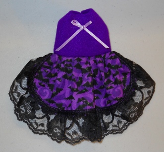 These little dresses are made in a variety of ways. This one is a cute Bat Print with a Purple polar fleece top complete with a little Lilac bow and Black lace trim.
