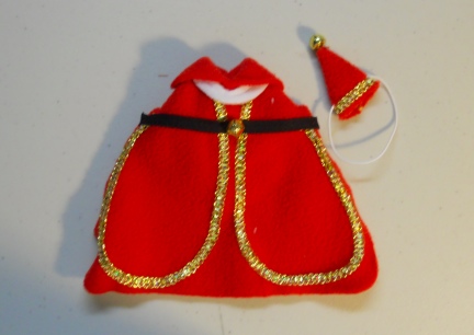 All of my items are my own design and pattern. This is a cute little idea was Santa Inspired. It is made with Red fleece and has Fancy Gold Trim and a ringing bell on both the belt and the matching hat.
