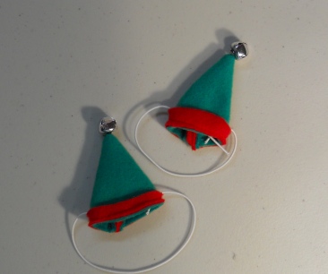 This hat is made of quality polar fleece in Green is trimmed in Red polar fleece with a ringing Silver Bell on top. The hat attaches to your pet's head with elastic. If you have a dark colored pet you might want to dye the elastic with a permanent marker, let dry before placing on the pet's head.