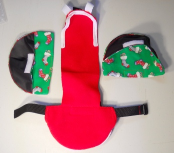 This Goose Diaper Holder Harness is made with A Red Fleece with White trim, it comes with TWO Christmas Print removable diaper inserts , backed with a waterproof fabric and it is oh so cute. This Goose Diaper Holder can be lined with a sanitary napkin, a human baby diaper, a folded newspaper page or other folded papers.