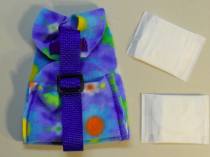 The Goose Diaper Holder I have designed is made of polar fleece. Polar Fleece is light weight, soft, has a bit of give/stretch to it and can be washed in the washing machine or by hand and hung to dry. Polar Fleece was created for sportsmen. You can wash out polar fleece, ring it out very well, and put it back on, even damp it will dry pretty quickly. When polar fleece first came out I was backpacking with and training and racing sled dogs....wonderful stuff. Before it, fabrics used would hold the water or wetness that sportsmen would encounter. Polar Fleece is non absorbent and perfect for Goose Diaper Holders.