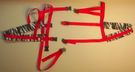 Goat Harness Facts: Webbing: RED Polly Webbing Padding: ZEBRA PRINT Polar Fleece Rings: Heavy Weight Welded Metal Buckles: Quick Release Heavy Weight High Impact Plastic