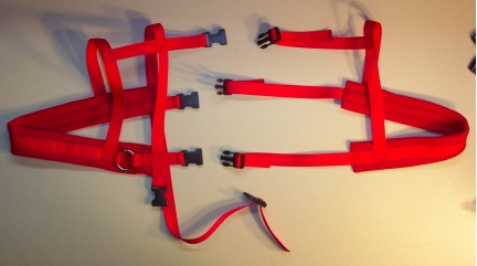 Goat Harness Facts: Webbing: RED Polly Webbing Padding: RED Polar Fleece Rings: Heavy Weight Welded Metal Buckles: Quick Release Heavy Weight High Impact Plastic