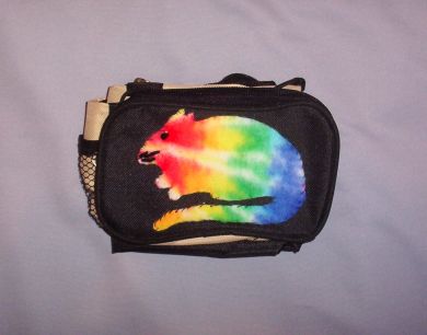 The Tye Dye polar fleece rattie cut out is hand sewn on to the Fanny Pack. The rattie has an E Bead eye and yarn whiskers.