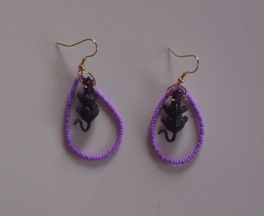 These cute little black rat charms are mounted on gold toned fish hook wires with a Purple Bead Hoop around each one - for pierced ears. The little rat charms are approx 1"